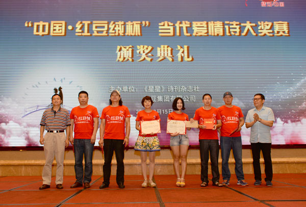 為了進(jìn)一步繁榮愛情詩創(chuàng)作,弘揚(yáng)正確愛情觀,特別是推動(dòng)中國當(dāng)代愛情詩再度輝煌,2014年7月1日,由《星星》詩刊雜志社與紅豆集團(tuán)聯(lián)合啟動(dòng)了“中國?紅豆絨杯”當(dāng)代愛情詩大獎(jiǎng)賽征文活動(dòng),作為紅豆七夕節(jié)的一項(xiàng)重要活動(dòng)?,F(xiàn)在經(jīng)過一年的征集及后期評(píng)選,在今年七夕——中國情人節(jié)前夕頒獎(jiǎng)。
