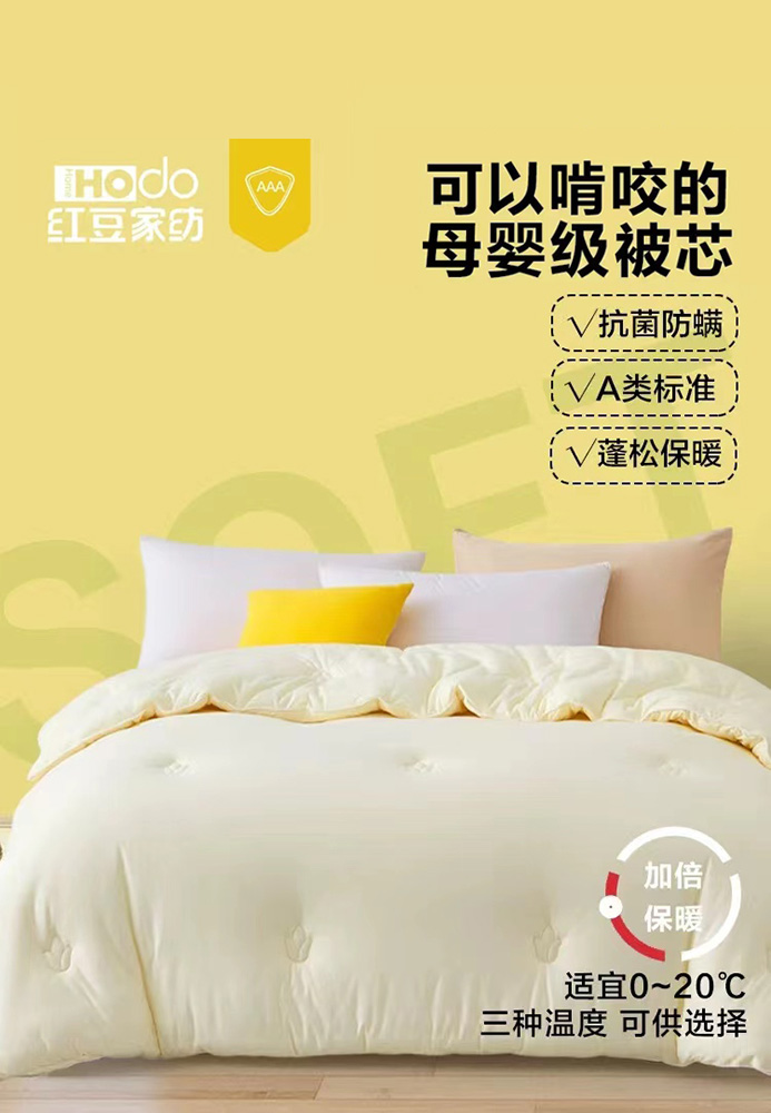 ? ? ? ? 紅豆家紡有限公司是紅豆集團子公司之一,自1998年成立以來,紅豆家紡不斷推進品牌建設,實現(xiàn)轉(zhuǎn)型升級,逐漸形成了HOdo紅豆家紡連鎖專賣、電子商務、家紡生產(chǎn)、小商品四大產(chǎn)業(yè)布局。多年來,紅豆家紡榮獲了“十大環(huán)保家紡品牌”、“中國最具流行魅力家用紡織品品牌”、“新銳時尚品牌”和“全國紡織實施卓越績效模式先進企業(yè)”等榮譽。紅豆家紡始終堅持“品質(zhì)至上”,集設計、生產(chǎn)、銷售于一體,以“親情、愛情、友情”為品牌的核心理念,積極打造“溫馨、經(jīng)典、時尚”的家紡產(chǎn)品。產(chǎn)品涵蓋家居產(chǎn)品全系列,被芯系列、套件系列、枕芯系列、婚慶系列、絨毯系列、床墊系列、夏涼系列等上千種產(chǎn)品,以滿足家居紡織品一站式的消費方式。