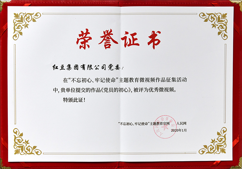 紅豆集團(tuán)參評(píng)的《黨員的初心》,經(jīng)過專家評(píng)選,網(wǎng)絡(luò)投票,從全國4000多件作品中脫穎而出,被評(píng)為50個(gè)“優(yōu)秀微視頻”作品之一,紅豆集團(tuán)也是全國唯一一家民營企業(yè)獲得此項(xiàng)殊榮。